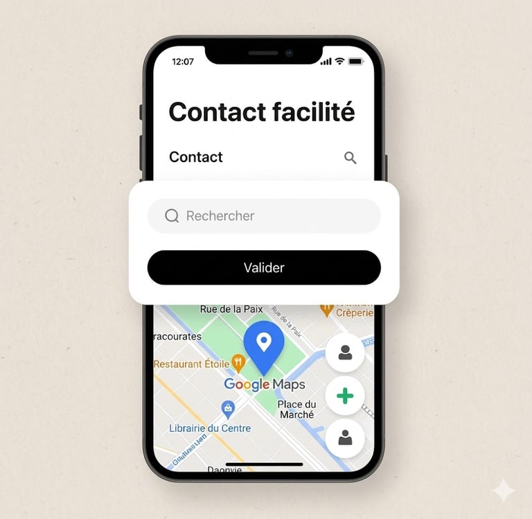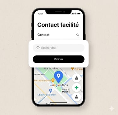 Formulaire de contact, bouton d'appel direct, et intégration d'un plan d'accès (Google Maps).